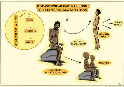 This ongoing research project, in collaboration with Dr. Joy Bose, focuses on illustrating the maladaptation of the immune system caused by malnutrition. The artwork visually represents how poor nutrition can impair immune responses, providing a clearer understanding of this complex relationship. Through a blend of scientific accuracy and creative design, this illustration aims to make the findings more accessible and engaging for both researchers and the general public.